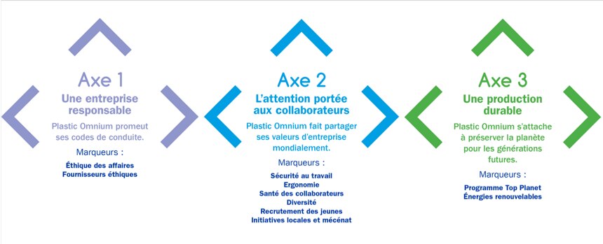 Aujourd’hui Plastic Omnium lance son nouveau programme RSE, ACT FOR ALL !Il marque une nouvelle ambition dans un esprit de progrès et d’amélioration continue de notre démarche sécurité et environnementale. Programme global et fédérateur, ACT FOR ALL matérialise l’engagement d’un Groupe responsable aux pratiques d’entreprise durables. Les objectifs opérationnels sont mondiaux. Dans chaque site, des actions seront entreprises pour former les équipes aux obligations éthiques, à la préservation de l’environnement, au soutien des populations locales, à la santé-sécurité. Face aux importants défis technologiques, climatiques et sociétaux, ACT FOR ALL est en engagement général dans l’intérêt général, afin de systématiser et de mesurer nos actions auprès de tous, tous les jours. Notre politique RSE, bâtie sur 3 axes fortsUN ENGAGEMENT GENERAL DANS L’INTERET GENERAL La démarche ACT FOR ALL bâtie sur 3 axes, balisés de 10 marqueurs chiffrés, guide notre action, dans l’intérêt de toutes les parties prenantes : Agir et produire de manière responsable et dans le respect de tous, fait partie de la culture Plastic Omnium. Equipementier et leader mondial, la réduction des émissions des véhicules est notre ADN et le fil rouge de nos recherches et la fierté de nos collaborateurs.